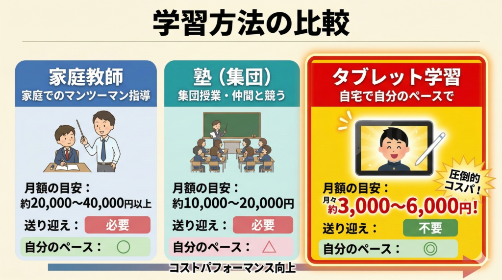 しかも、塾や家庭教師と比較するとコスト面でも明らかな差が。