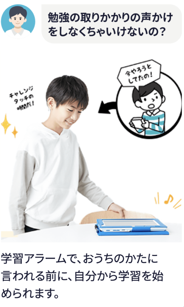 今まではなかなかやる気が出ず、寝っ転がりながら漢字を書くような状態でした。チャレンジタッチを始めてからは学習アラームで自分から机に向かうようになり、その場ですぐ正解がわかるのでゲーム感覚でサクサク進められるようになりました。集中力が全然違います!