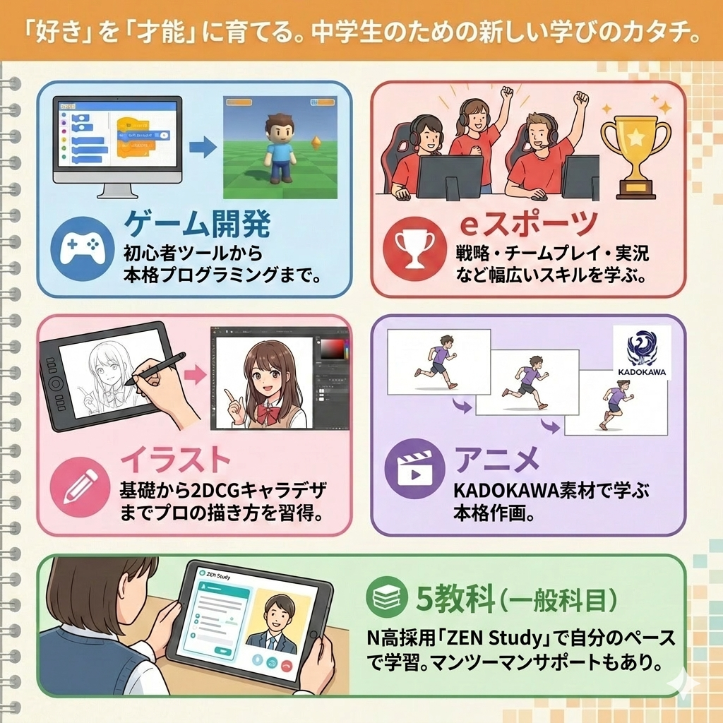 一言でいうと「中学生がゲーム・イラスト・eスポーツ・アニメを本格的に学べる場所」です!