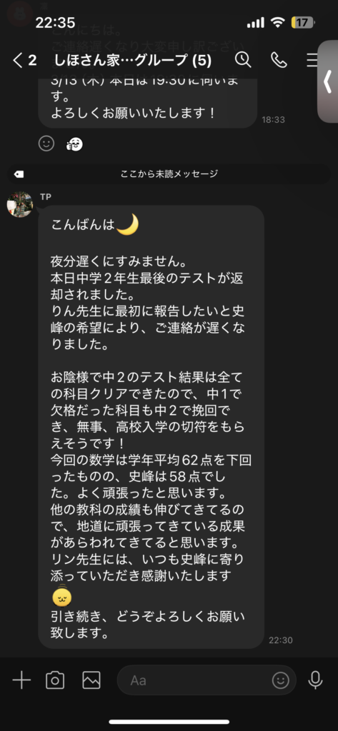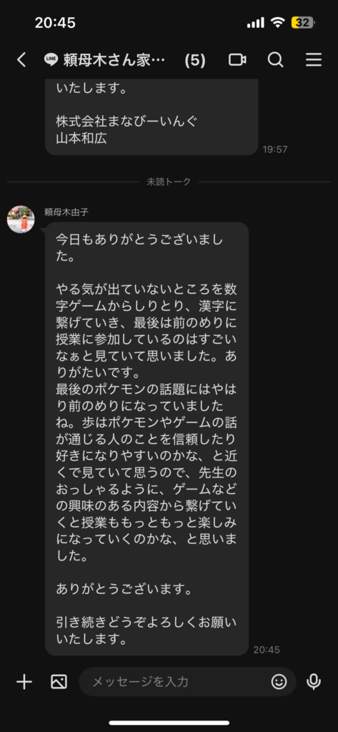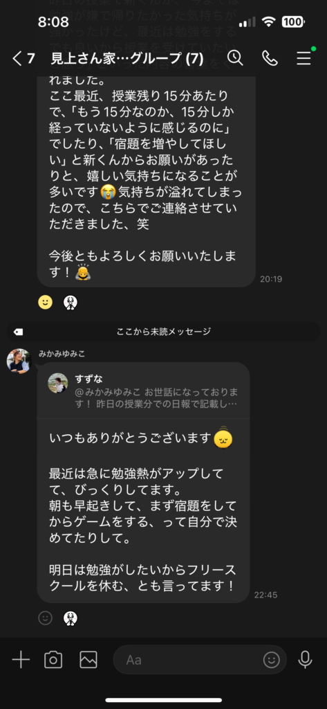 まなびーいんぐはご家族とLINEグループの中でメッセージを行います。