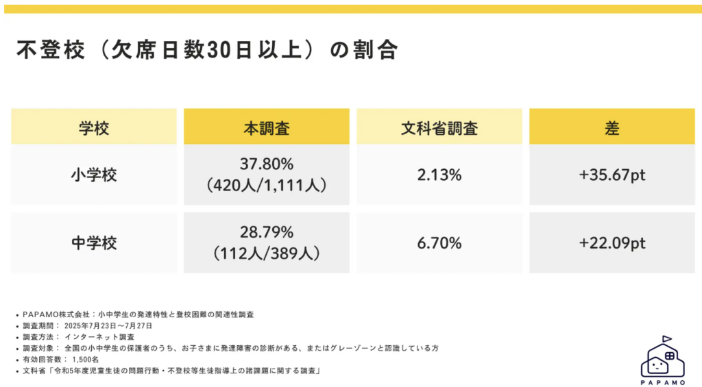 また、発達障害を持つ子は、文科省調査の般の不登校率のなんと小学生で約17.7倍、中学生で約4.3倍にものぼるとのデータも。(添付画像参照)