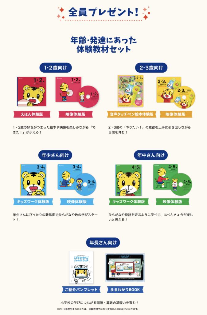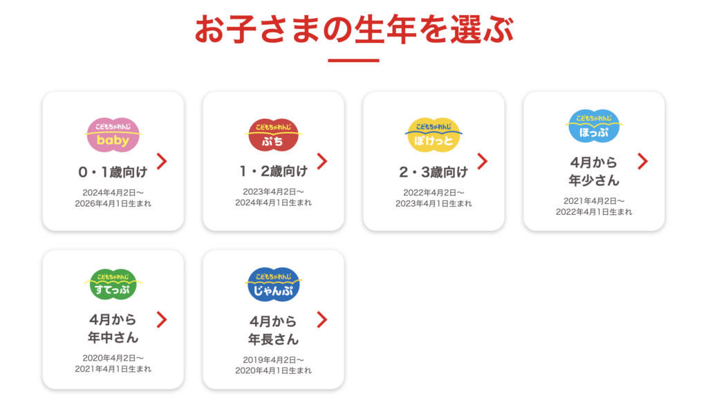 0〜6歳で年齢別に細かく教材が分かれており