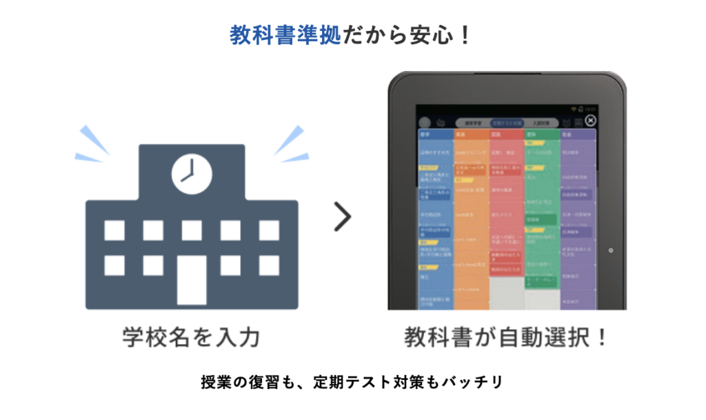 学校で使っている教科書に沿って学べるため、「学校の授業と同等」と判断されやすいのが大きな強みです。遅れた単元のさかのぼり学習も可能です。