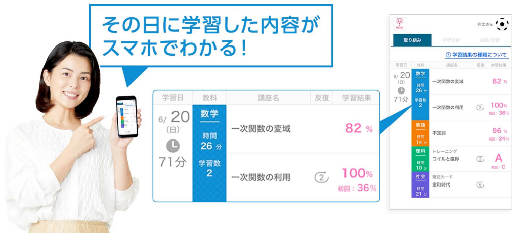 いつ・何を・どれくらい勉強したかが自動で記録されます。親御さんは専用アプリで確認でき、先生への報告も口頭より明確なデータで行えます。