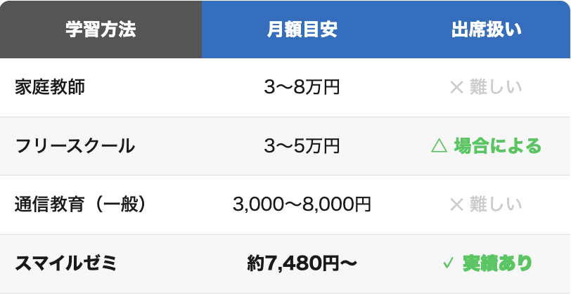 家庭教師やフリースクールと比べると費用は大幅に抑えられ、かつ出席扱いの実績があるのはスマイルゼミの大きな強みです。