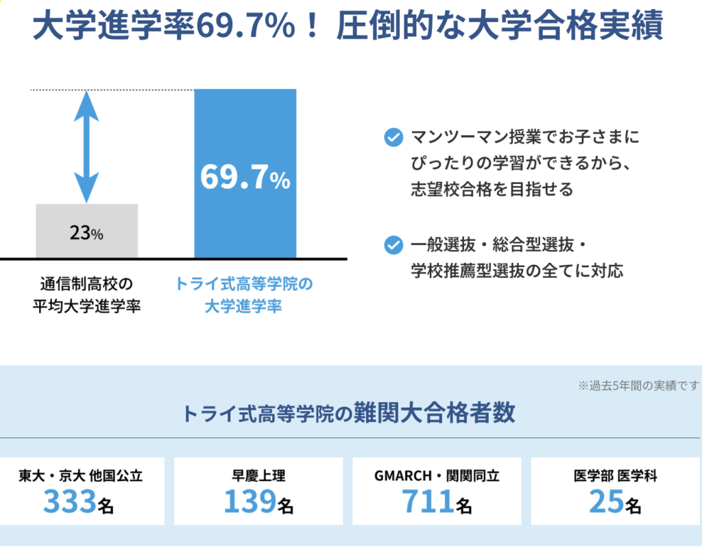 トライ式高等学院」は学習支援を通じて、大学進学率は69.7%と、通信制高校の平均進学率の3倍を誇る高い合格実績を持っています。