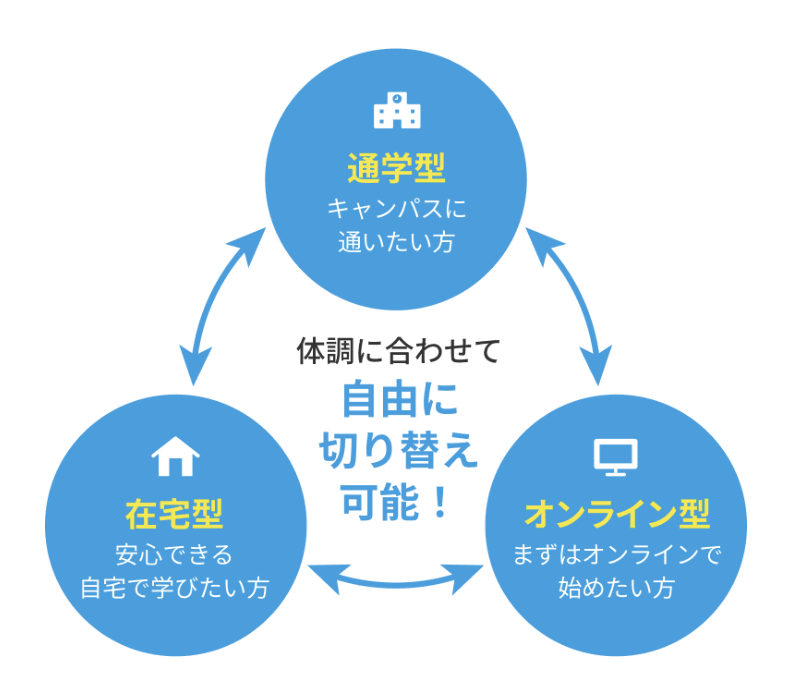 トライ式高等学院」では通学型、在宅型、オンライン型と、体調や状況に合わせて通学スタイルを変更でき、どのスタイルでも充実した学習サポートを受けられます。