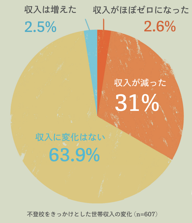 子どもの不登校がきっかけで「収入が減った」「収入がほぼゼロになった」世帯は合わせて33.6%、つまり3分の1を超えています。
